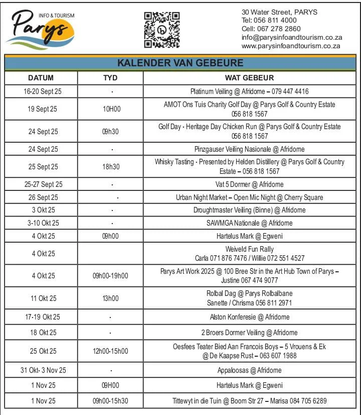 Discover what’s on in Parys! From riverside markets and art pop-ups to live music, foodie weekends, and outdoor adventures on the Vaal, our small town packs a big calendar. Browse the highlights below and plan your next unforgettable weekend.
